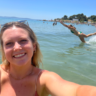 We tanned for a while, which we haven’t done in so long. It really had us tying it back to our normal summer days when we weren’t traveling the world, lol. We didn’t want to buy towels so we literally just laid on a concrete part of the beach. Haley left me alone while she tried to find sunscreen and people were looking at me so weirdly but I was just sitting not phased listening to my beach jams playlist. Haley returned after a little while and we went in the water and took funny photos and just really had a fun time messing around.
